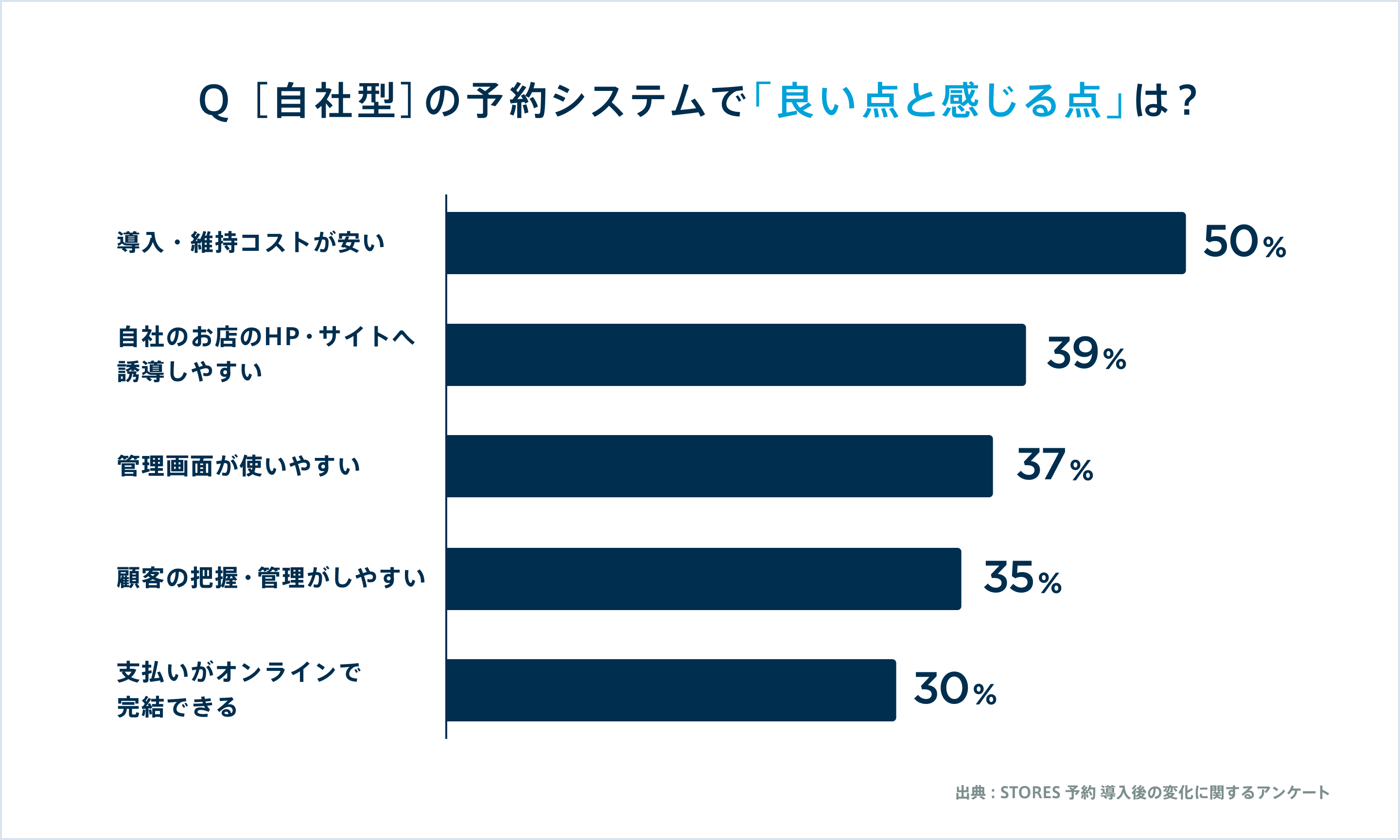 また自社型の予約システムで良いと感じる点について具体的に質問したところ、「導入・維持コストが安い(50%)」が1位に。