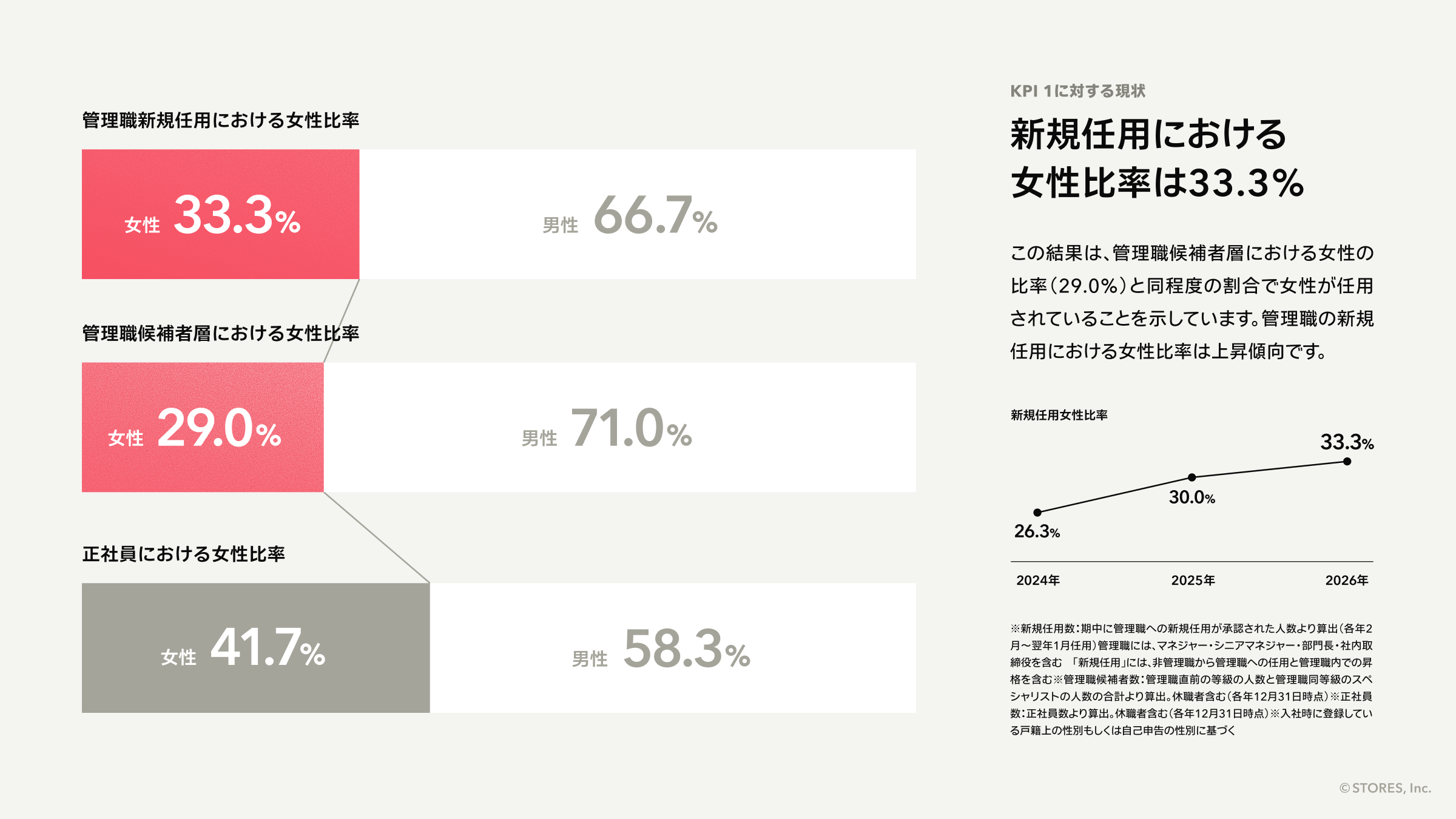 STORES は「Just for Fun」のミッションのもと、多様なこだわりや情熱を持つ人々を支援するため、組織自らが多様であることを重視しています。2030年までに「女性管理職比率40%」達成というコミットメントを掲げ、現状の数値をありのままに公開することで、社内外への約束として取り組みを加速させています 。本レポートでは、属性に関わらず公平に働ける環境づくりを目指し、特に社会的な課題であるジェンダーギャップの解消に向けた具体的な進捗と、2026年のアクションプランをまとめています 。